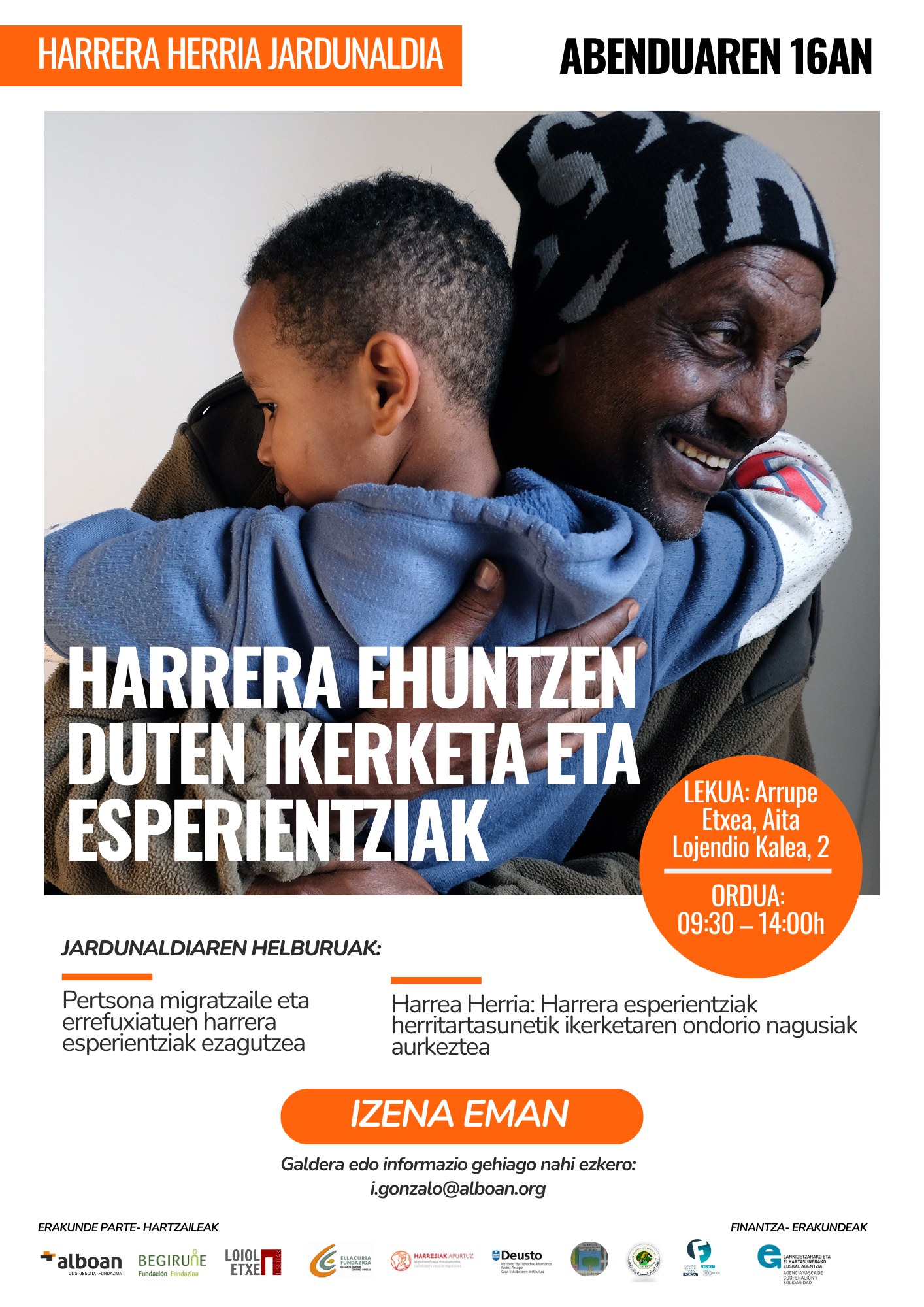Abenduaren 16an Harrera Herria jardunaldia burutuko dugu Bilboko Arrupe Etxean (Aita Lojendio, 2 kalea). Jardunaldian Euskadin eta Nafarroan garatzen diren migratzaile eta errefuxiatuen harrera esperientziak ezagutzeko egindako ikerketa aurkeztuko da.